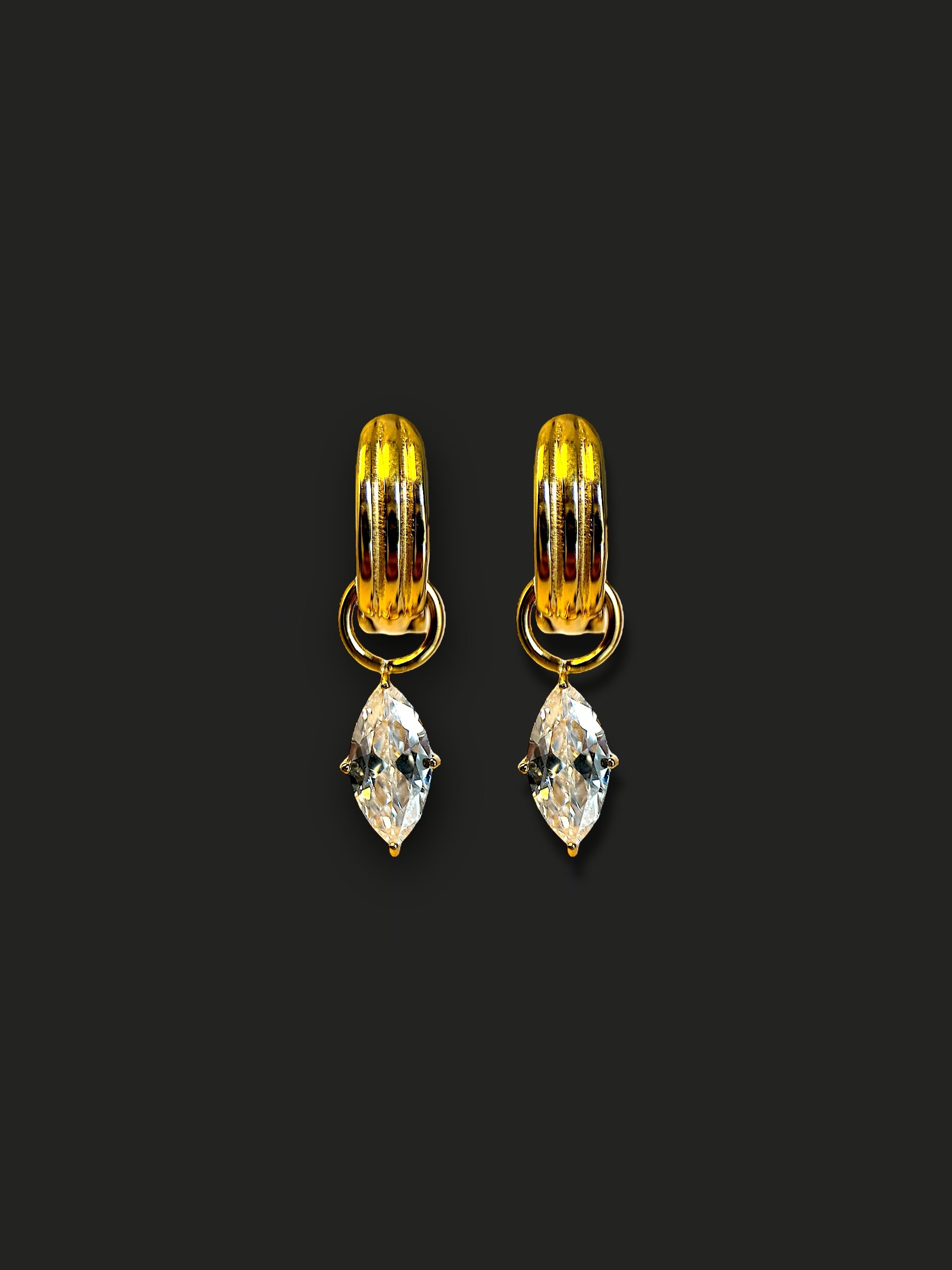 Huggies estilo clásico decorados con una zirconia en forma de rombo en tono blanca, tus nuevos aretes favoritos, 3 en 1, úsalo así, sin zirconia o la zirconia de dije en una cadena. Waterpoof, tu material favorito, acero inoxidable.