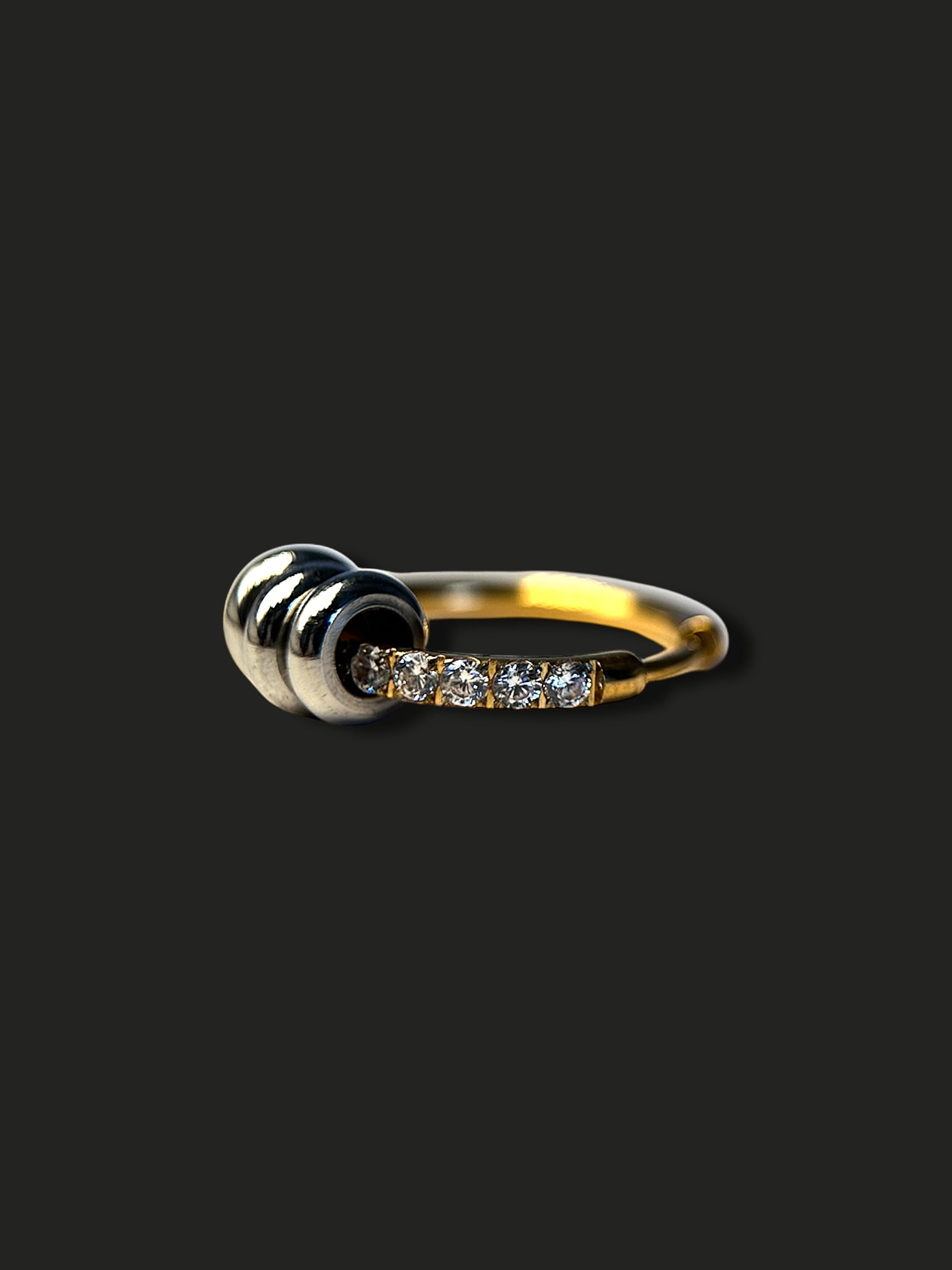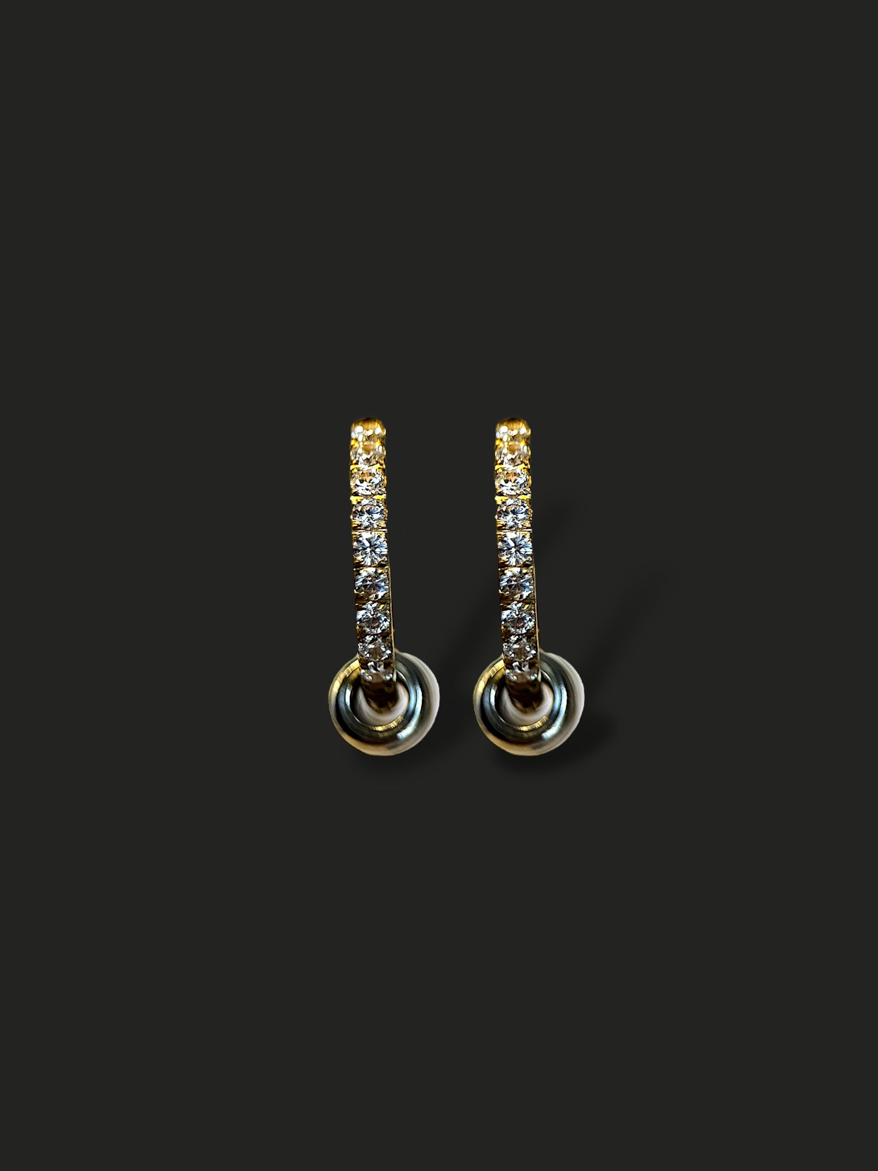 Huggies tono oro llenas de zirconias con 3 argollas plateadas colgando. Waterpoof, tu material favorito, acero inoxidable.
