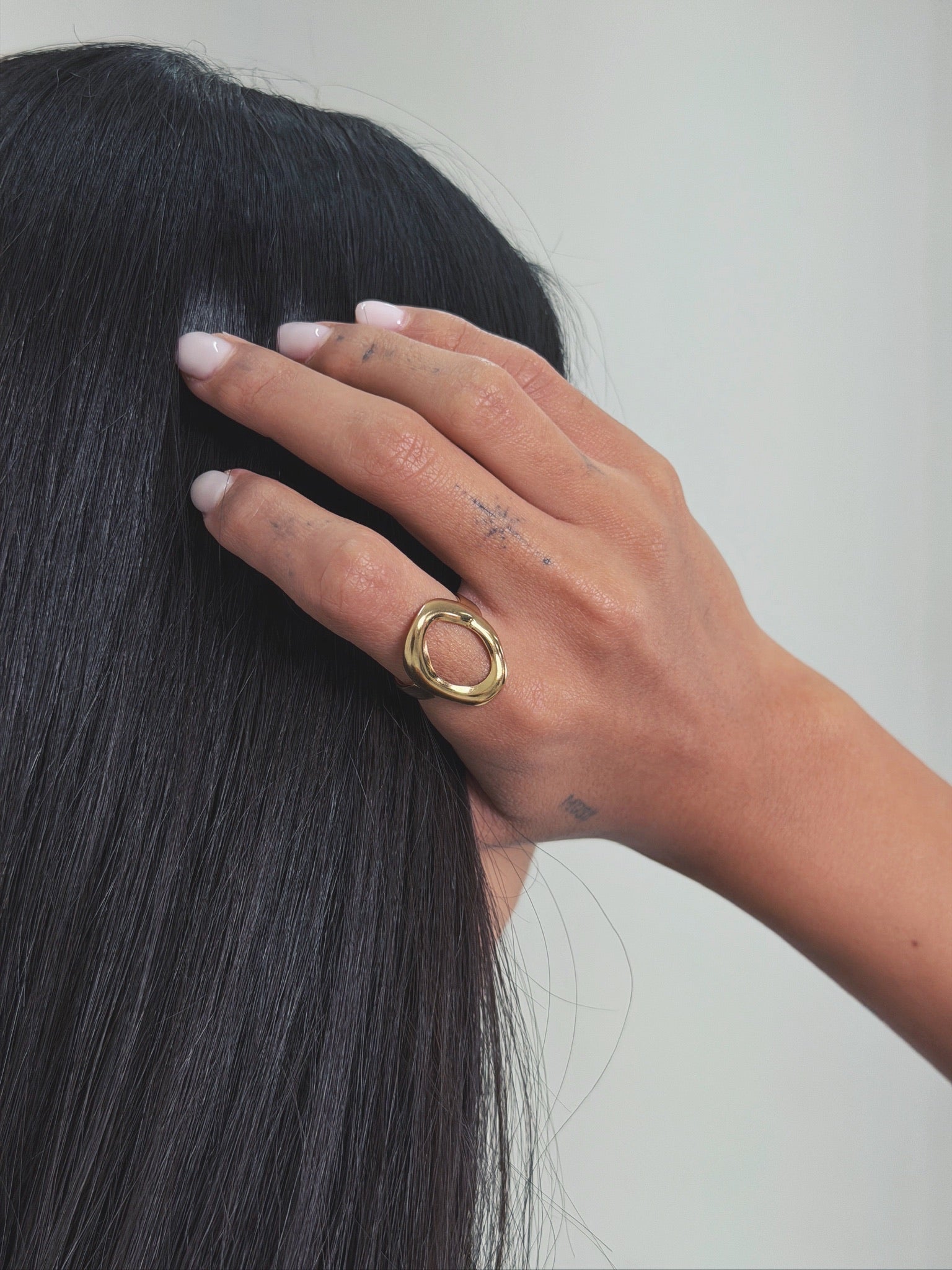 Anillo waterproof de diseño de circulo irregular, un anillo que se ha convertido en un básico muy cómodo por su tamaño y ligereza.