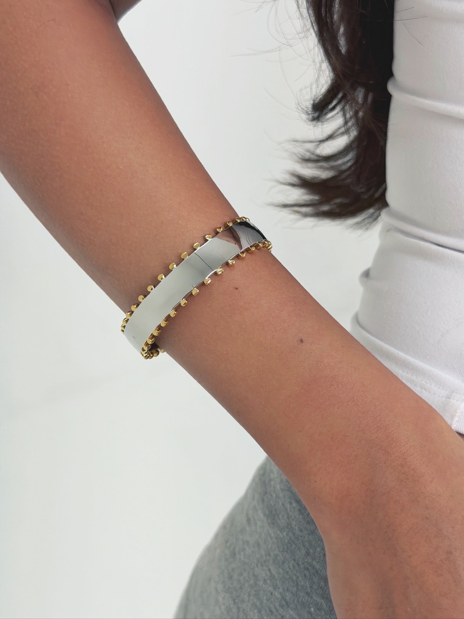 Brazalete waterproof clásico, cómodo y elegante con su diseño bicolor con balines dorados que hacen la diferencia.