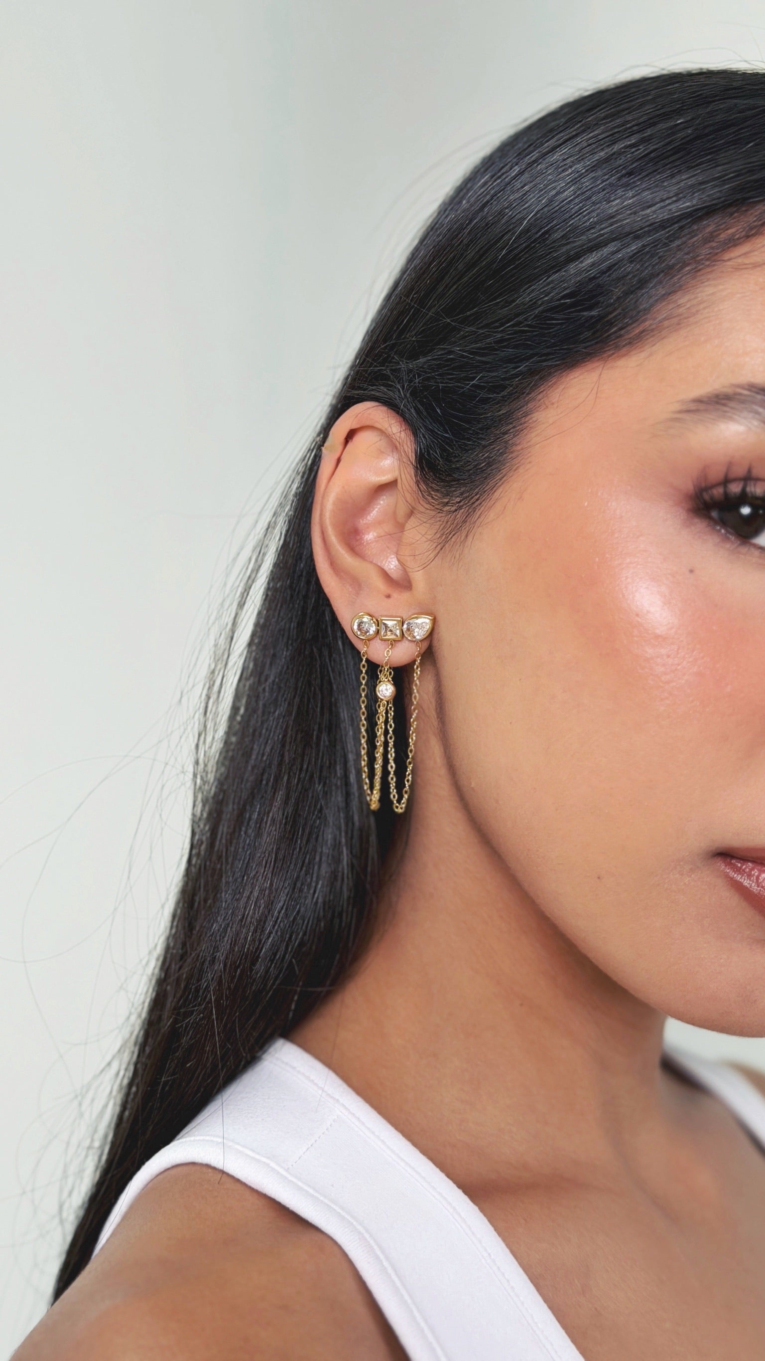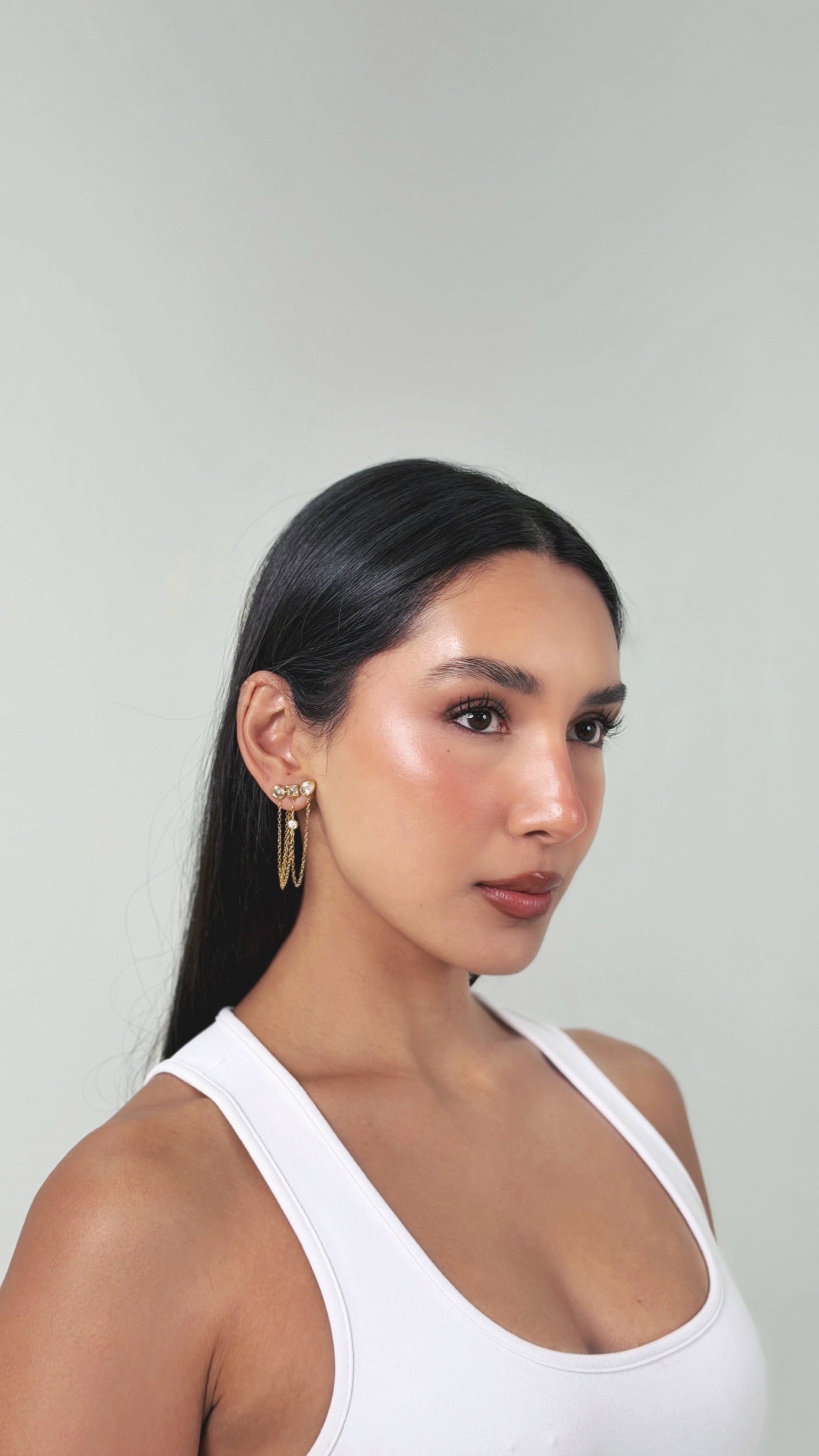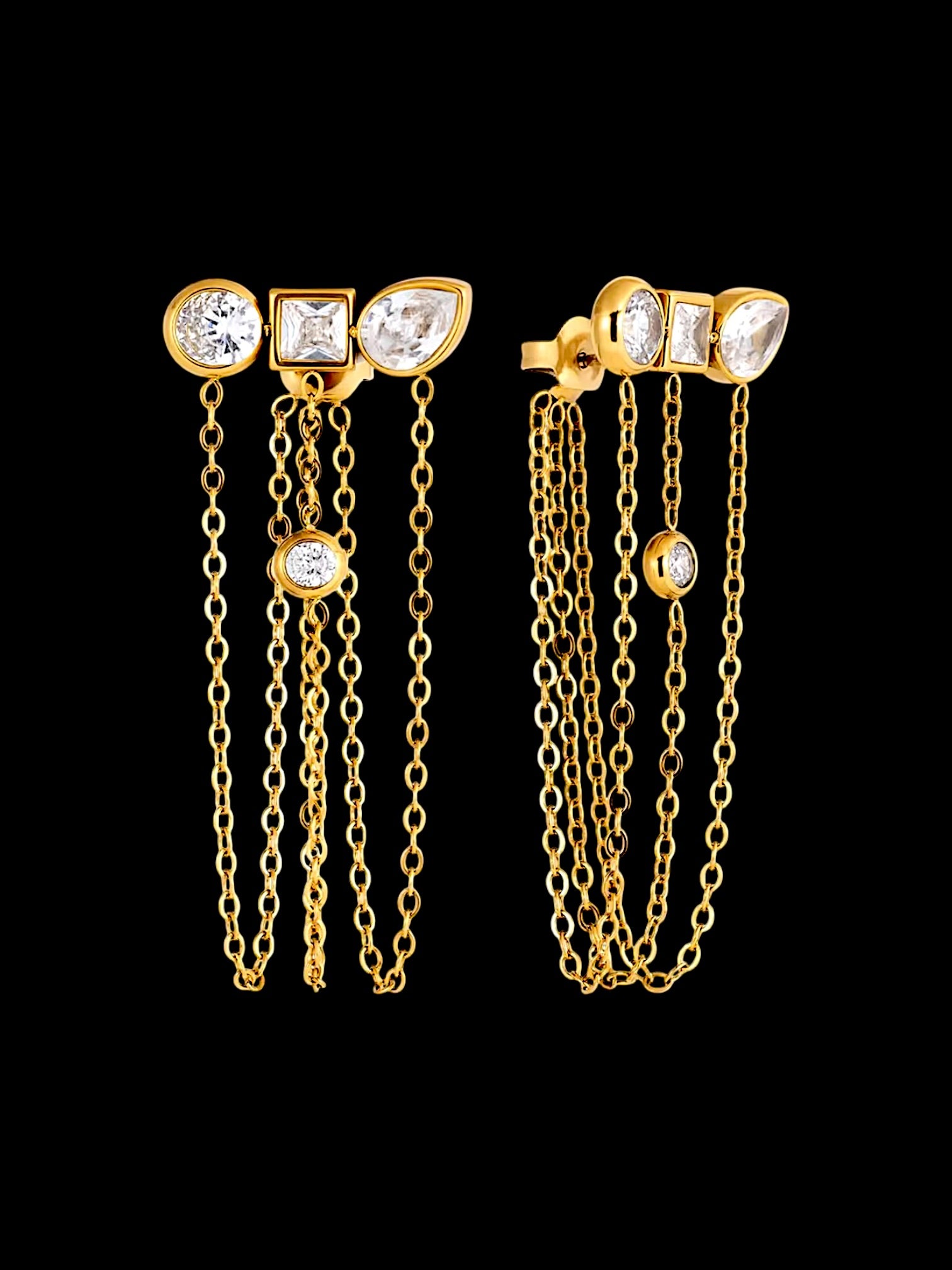 Aretes waterproof con diseño de 3 cadenas colgando y zirconias decorando.