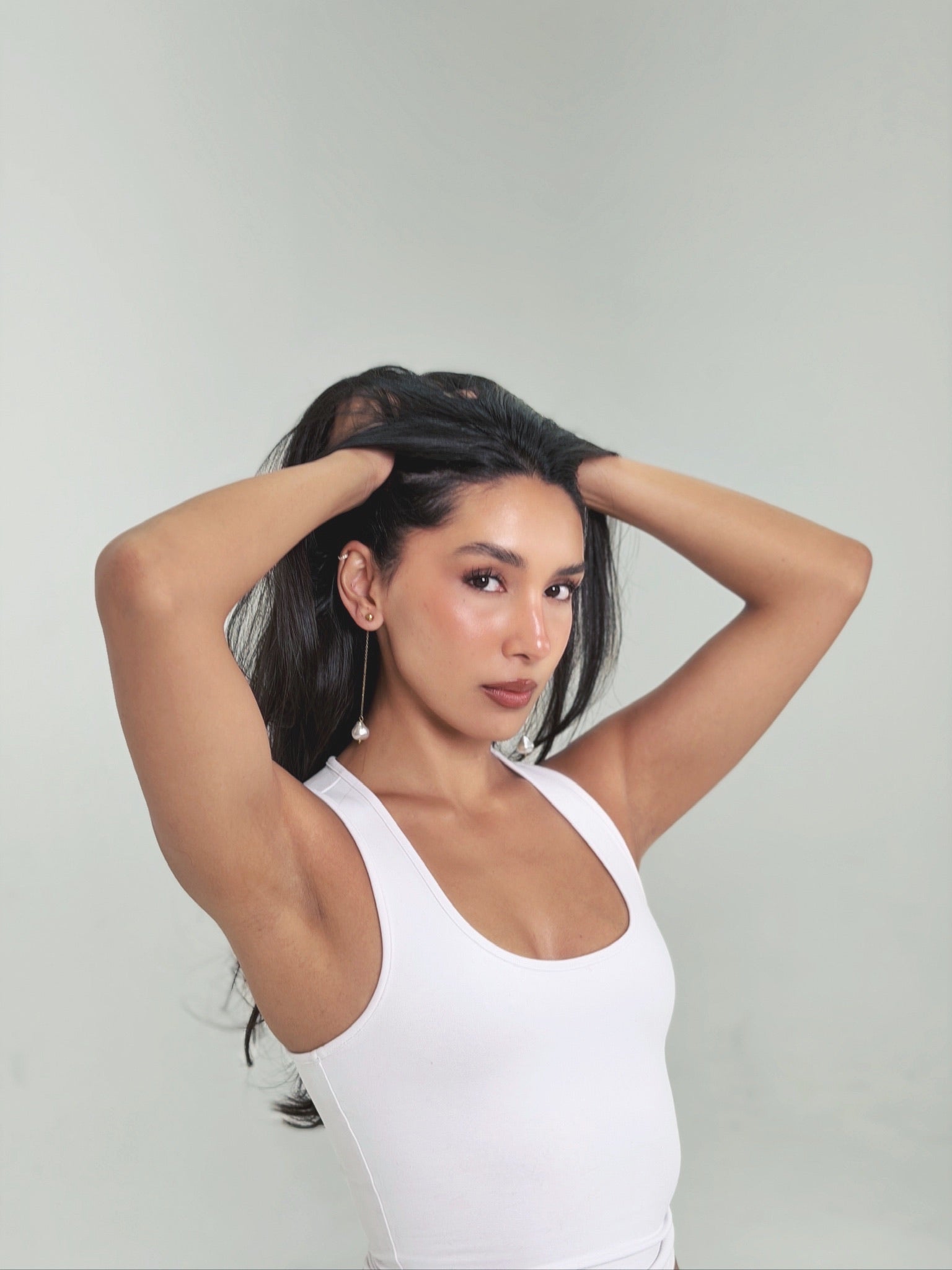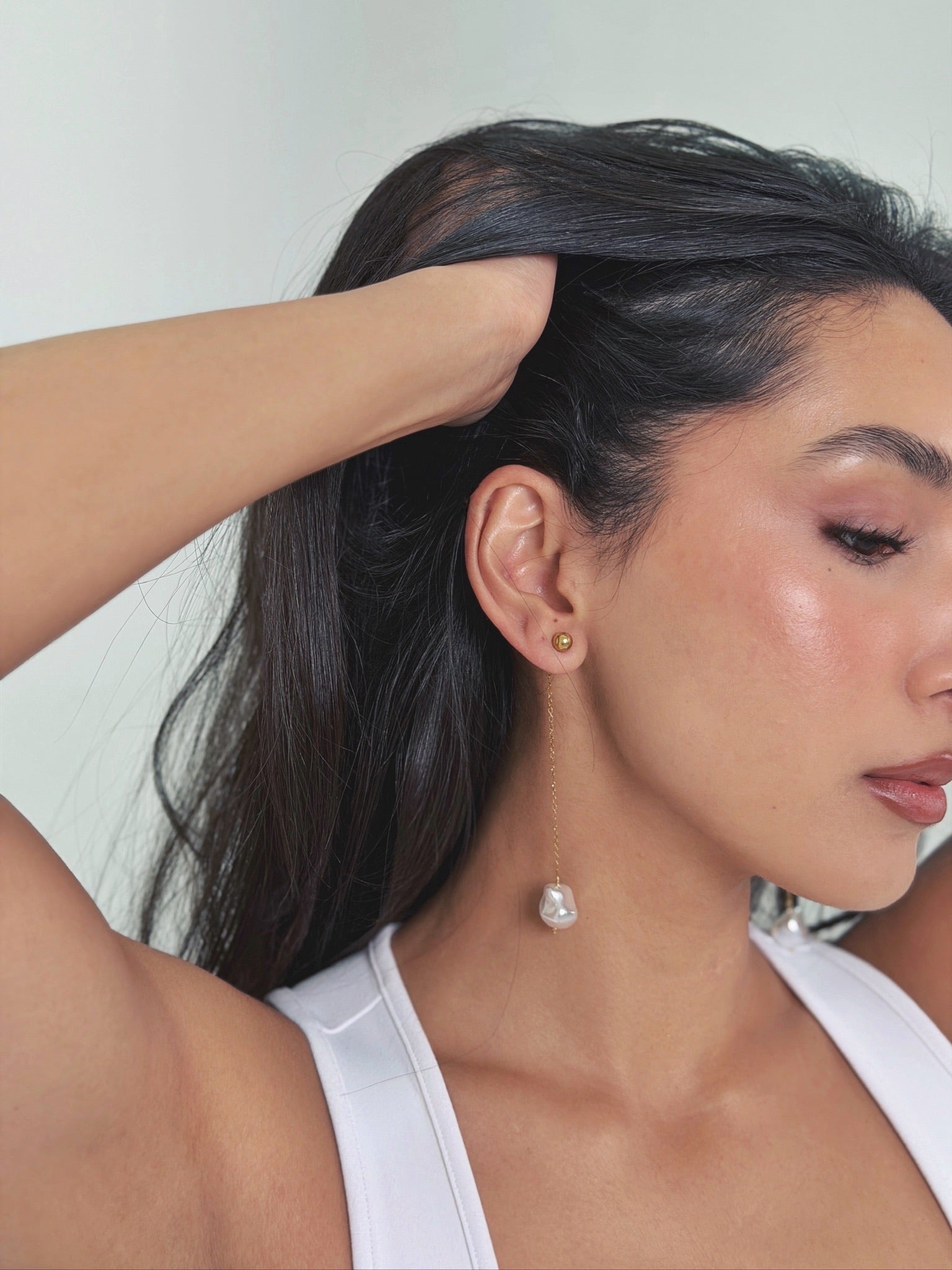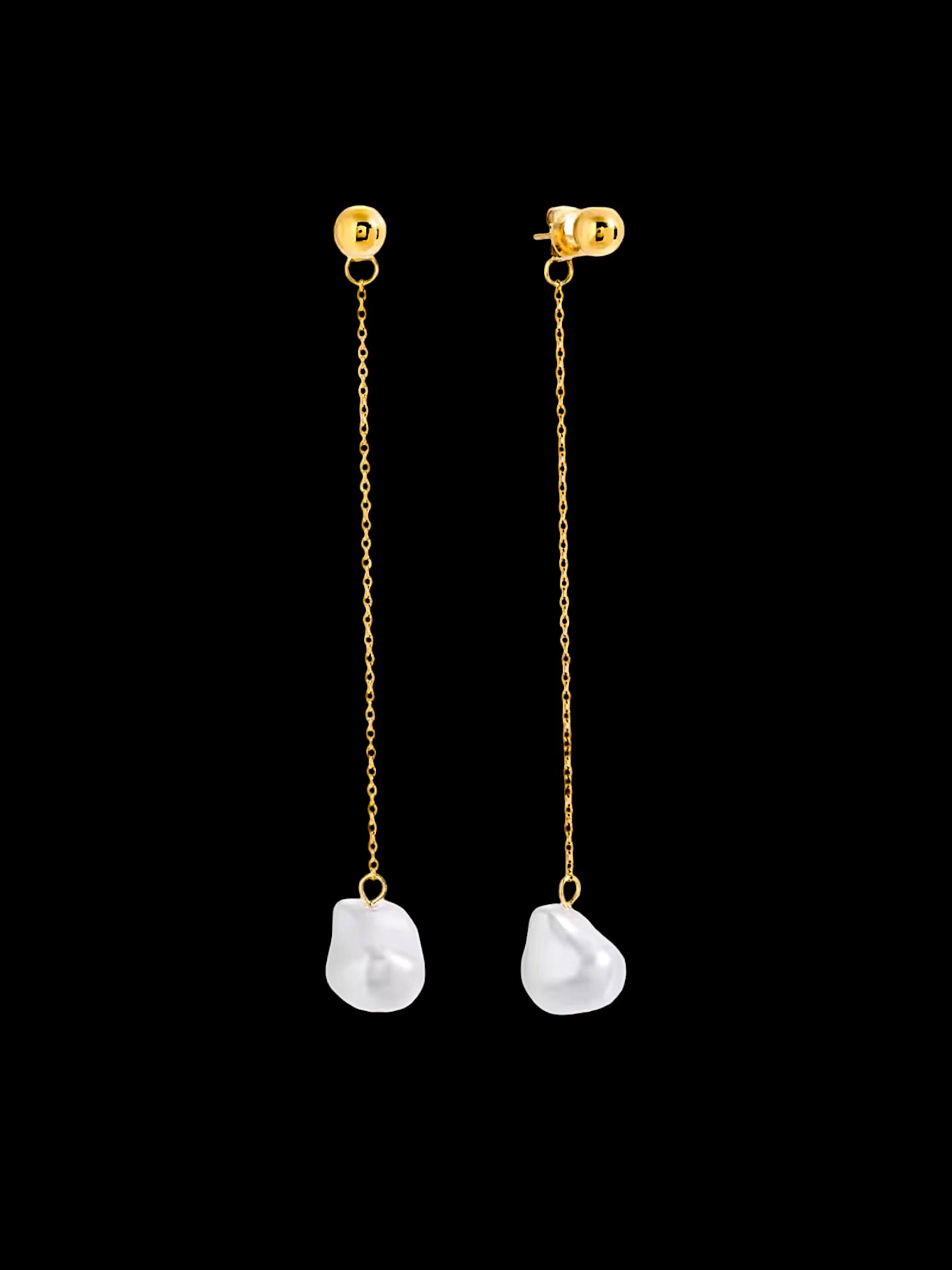 Aretes waterproof con diseño de broquel con cadena larga y perla colgando.